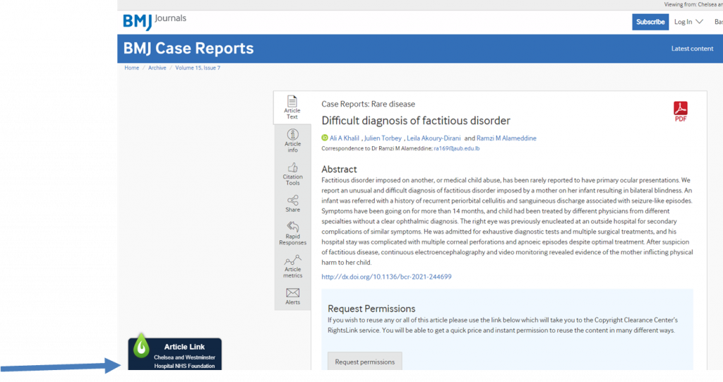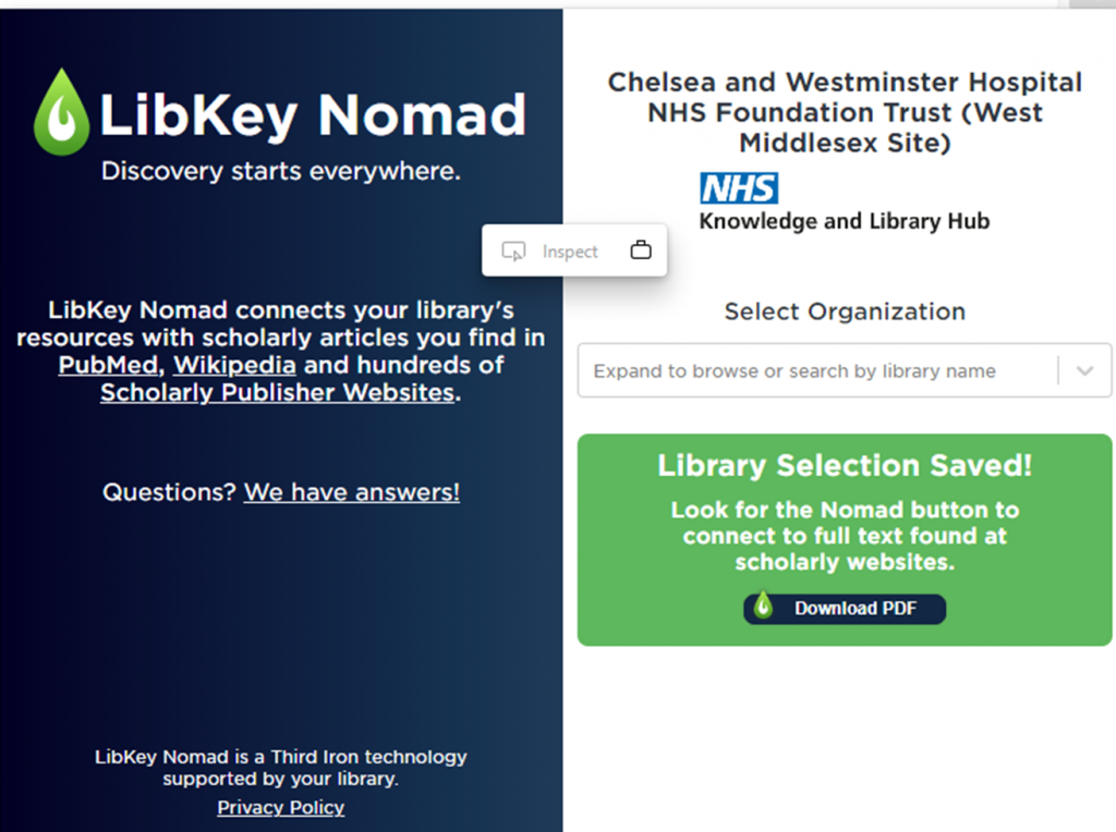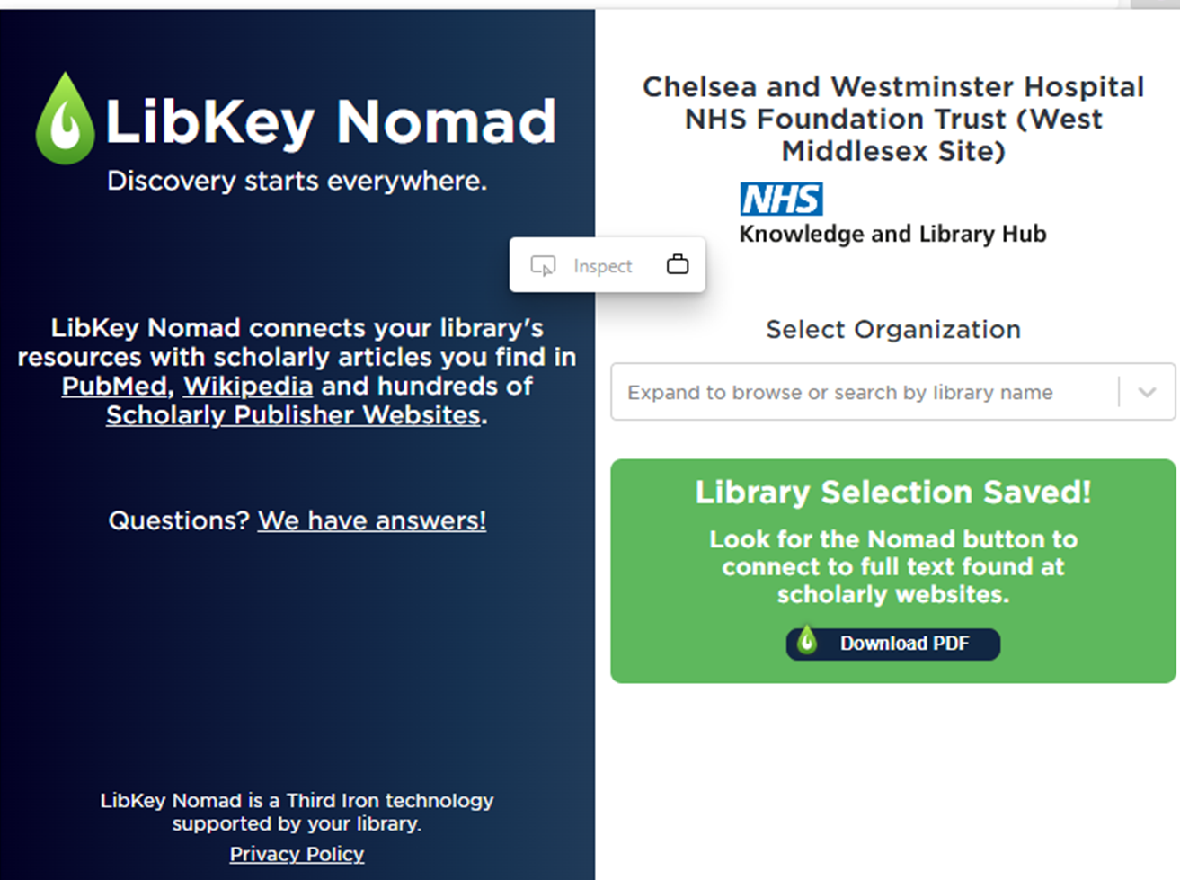 - After adding to your profile, LibKey Nomad prompts you to select your subscribing institution. Select ‘Chelsea and Westminster Hospital NHS Foundation Trust (West Middlesex site or Chelsea site). After that, it simply automatically scans for scholarly content wherever you may roam.
