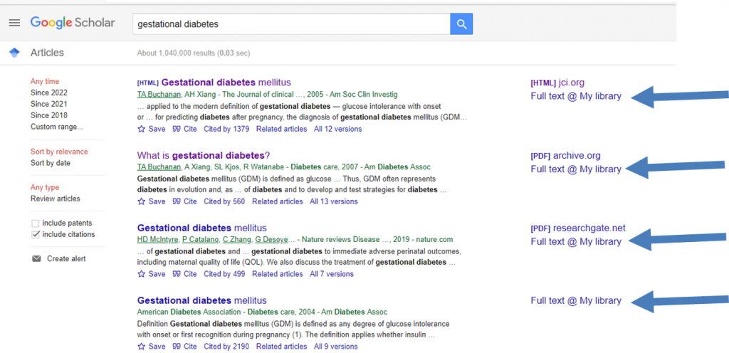 Now when you search Google Scholar you will see on the right hand side of the results, a row off links. If we have a subscription for an article, you will see a link displayed as as “Full text @ My library”. When you click on the link you will be able to access the full text of an article immediately.