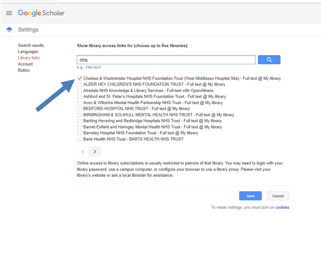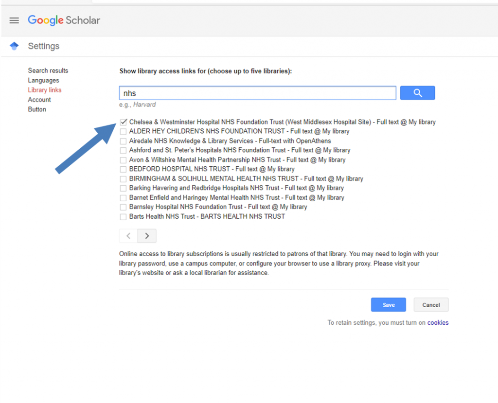 You can connect to the Library & Knowledge Service via Google Scholar settings & selecting ‘Chelsea and Westminster Hospital NHS Foundation Trust‘. This will give you direct access to our electronic resources.